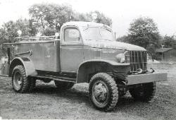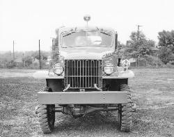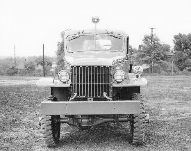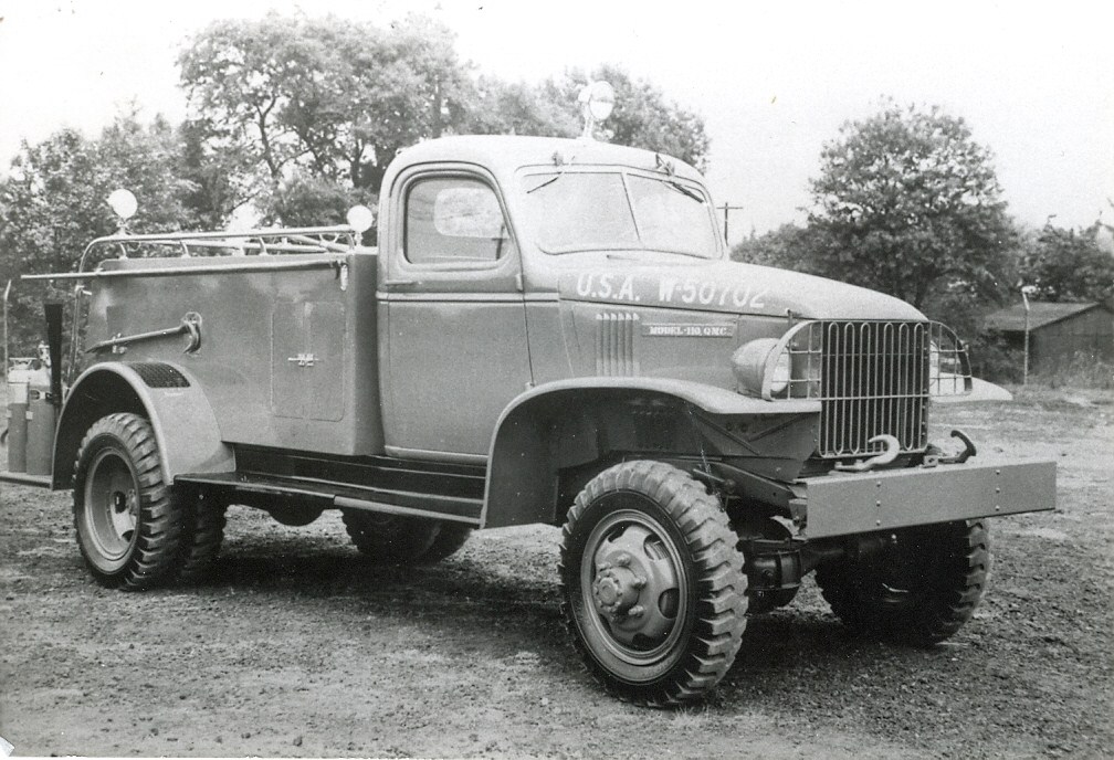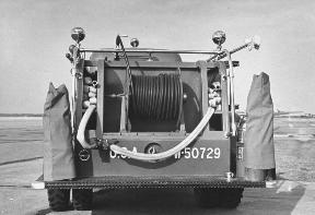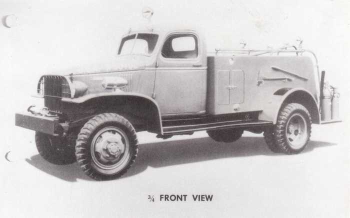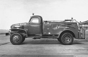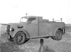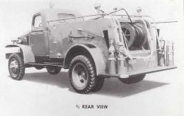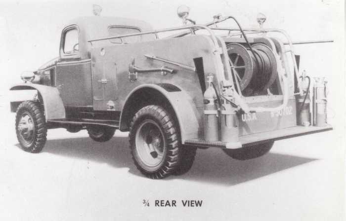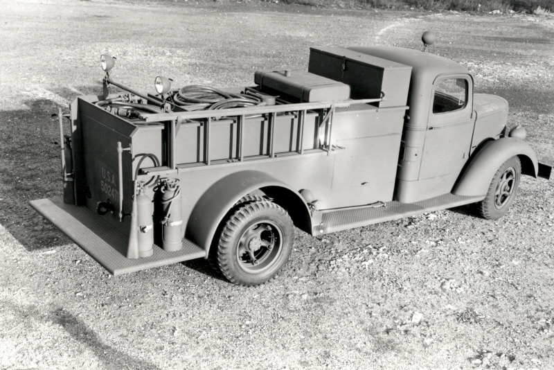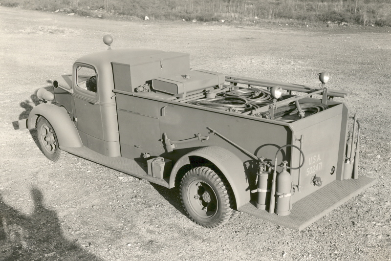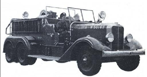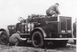 The first Crash Truck produced at the Quartermaster Depot, Fort Holabird in Baltimore, MD. It was built on a 1 1/2 ton, 4x4 chassis and was powered by a 73 HP Franklin Engine. The truck was equipped with a small capacity rotary gear pump and held 100 gals. of water. Cans of foam powder were carried atop the vehicle and a mechanical foam maker was mounted on the right running board. Foam was produced by adding the powdered foam mixture into the foam maker. The truck carried a small number of tools for rescue work. Records indicate that only two of these small trucks were built. W-503 and W-504. Number 503 was assigned to the Carlisile Barracks in PA while number 504 saw service at the Randolf Army Air Field, TX |