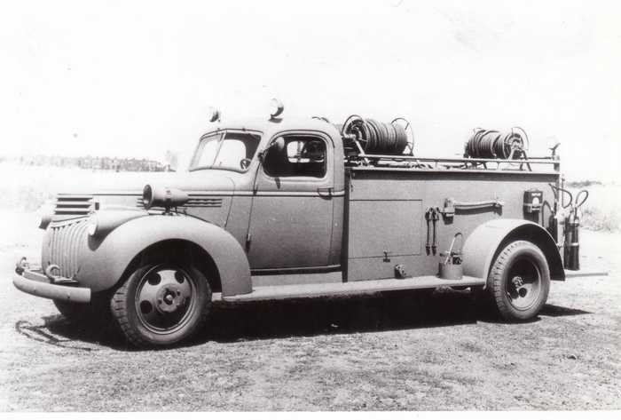 The Class 110 crash truck was built on the Chevrolet 4x4 chassis at the Motor Transport Shop, Camp Holabird, Baltimore and the Memphis Quartermaster Depot, Memphis. An additional 42 were constructed by the Oren Fire Apparatus Co. The Army produced trucks can be identified by a metal plaque stamped "Model 110 QMC" which covered the embossed the sides of the hood. The Class 110 was equipped with a 100 gpm centrifugal power take-off pump and a 250 gallon water tank. Foam liquid was premixed in the water tank and the mixture was supplied to the fire through 2, 100 foot 1 1/2 hose lines. Four fifty pound Carbon Dioxide cylinders were mounted in the body of the truck and attached to a hose reel at the rear of the vehicle. The hose reel carried 100 feet of 1/2 inch high pressure line and attached to a CO2 discharge horn. The 110 was equipped with a portable fire extinguisher and numerous hand tools for rescue work. |
