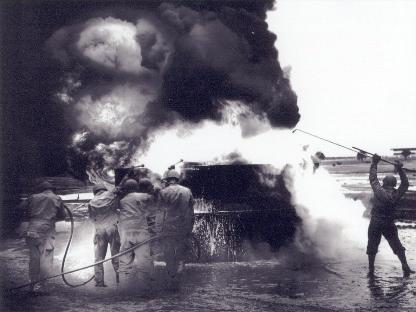 Many of the Engineer Fire Fighting Platoons stationed in England recieved 5 days training with the British National Fire Service. The fire school was located at Bulford Camp, Whitshire and these photos show one of the platoons with NFS firefighters. |